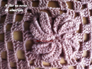 A parte de trás usei fios da Tropfil  rosa e salmom, iniciando com uma flor de 8 pétalas, a fim de formar o quadrado que precisava. Fiz a união de três lados e o quarto arrematei alinhavando com uma correntinha de 0,50cm, como as anteriores, facilitando assim a limpeza das capas.