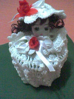 Mais uma bonequinha que serviu de embalagem para amêndoas carameladas coloridas.